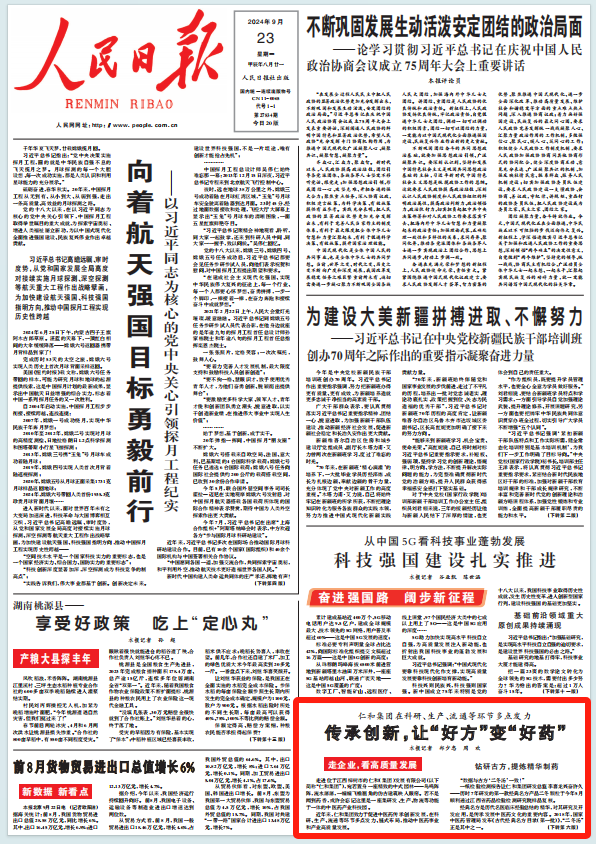 傳承創新,讓“好方”變“好藥” ——《人民日報》9月23日頭版點贊仁和集團