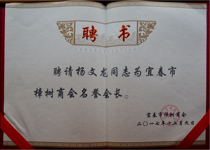 楊總當選宜春樟樹商會名譽會長 聘書 發布時間: 2019年12月18日 16:53:43 閱讀量: 15,694 下一篇:楊總當選宜春樟樹商會名譽會長上一篇:楊文龍董事長被評為2017年度全市“知名企業家”